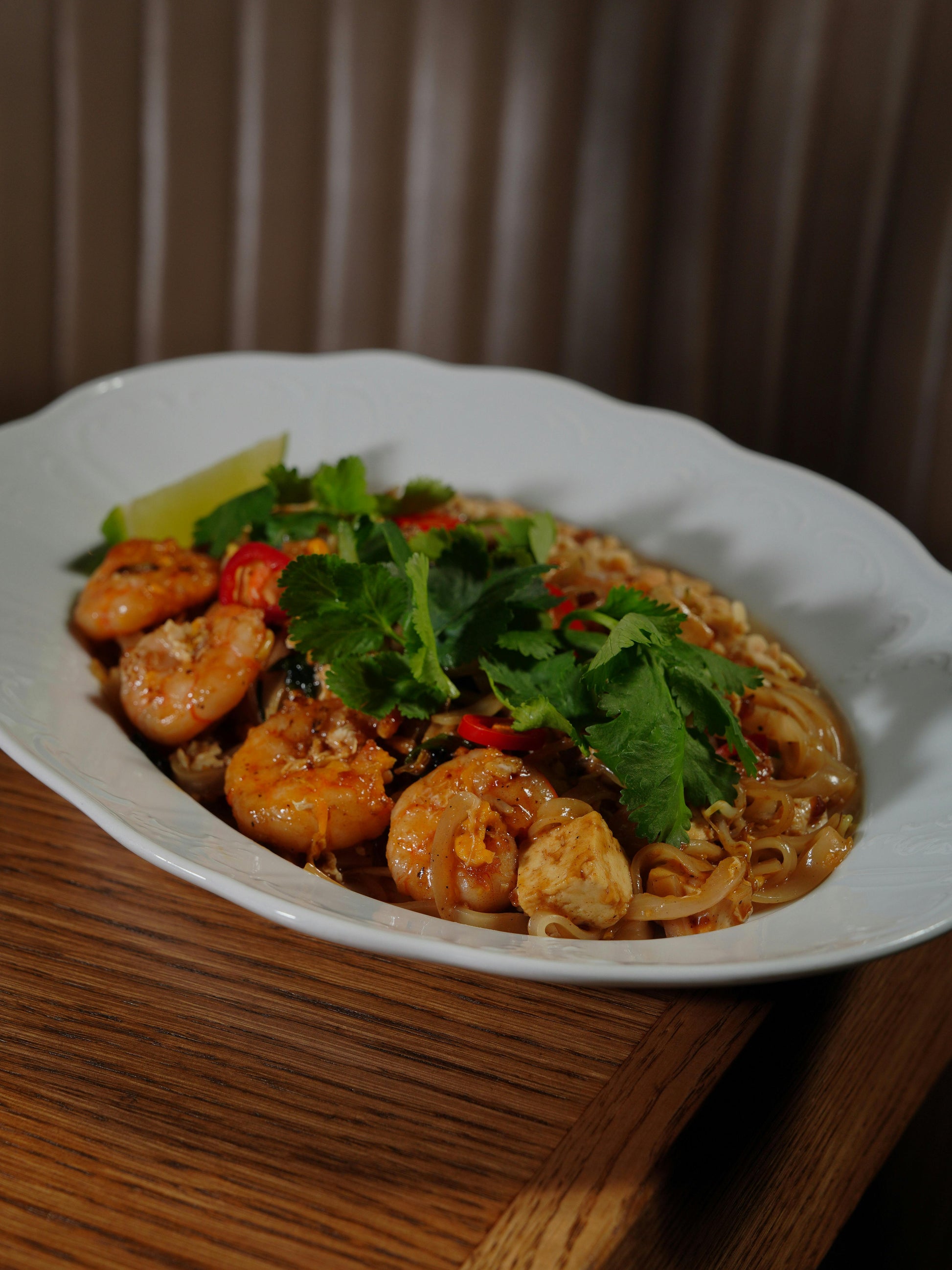 Ingredients: Tiger prawns, brown rice noodles, bell peppers, sesame seeds, chili lime